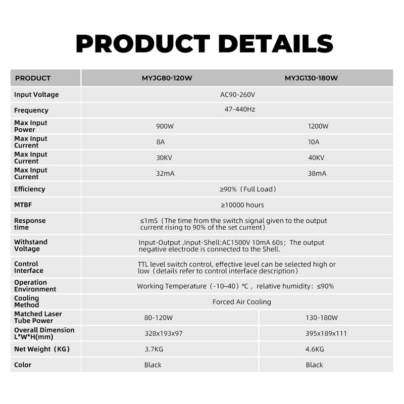 Fonte de Alimentação Laser CO₂ MYJG 80–180W 110V/220V para Equipamentos de Corte a Laser de 100W–120W - PRESIONQI